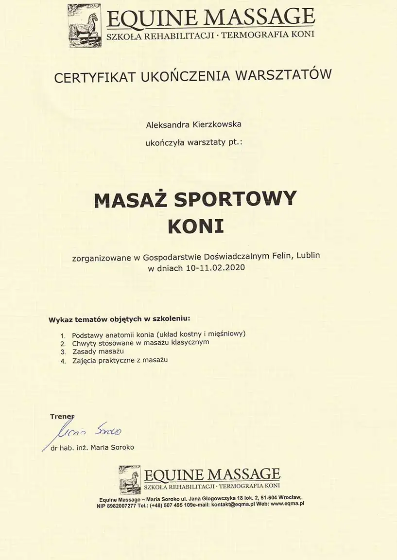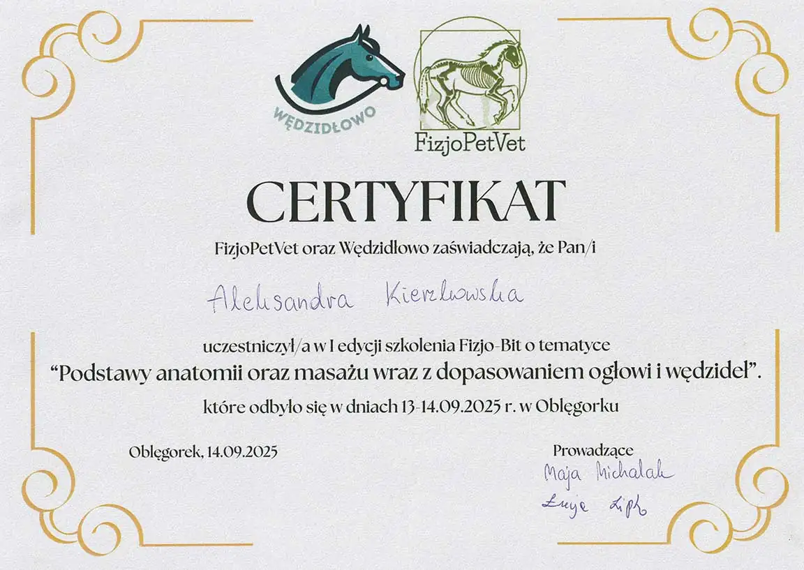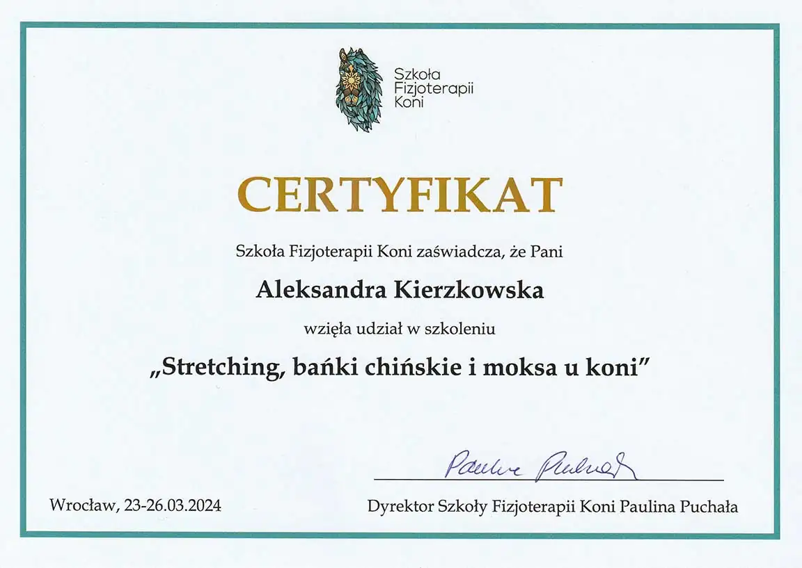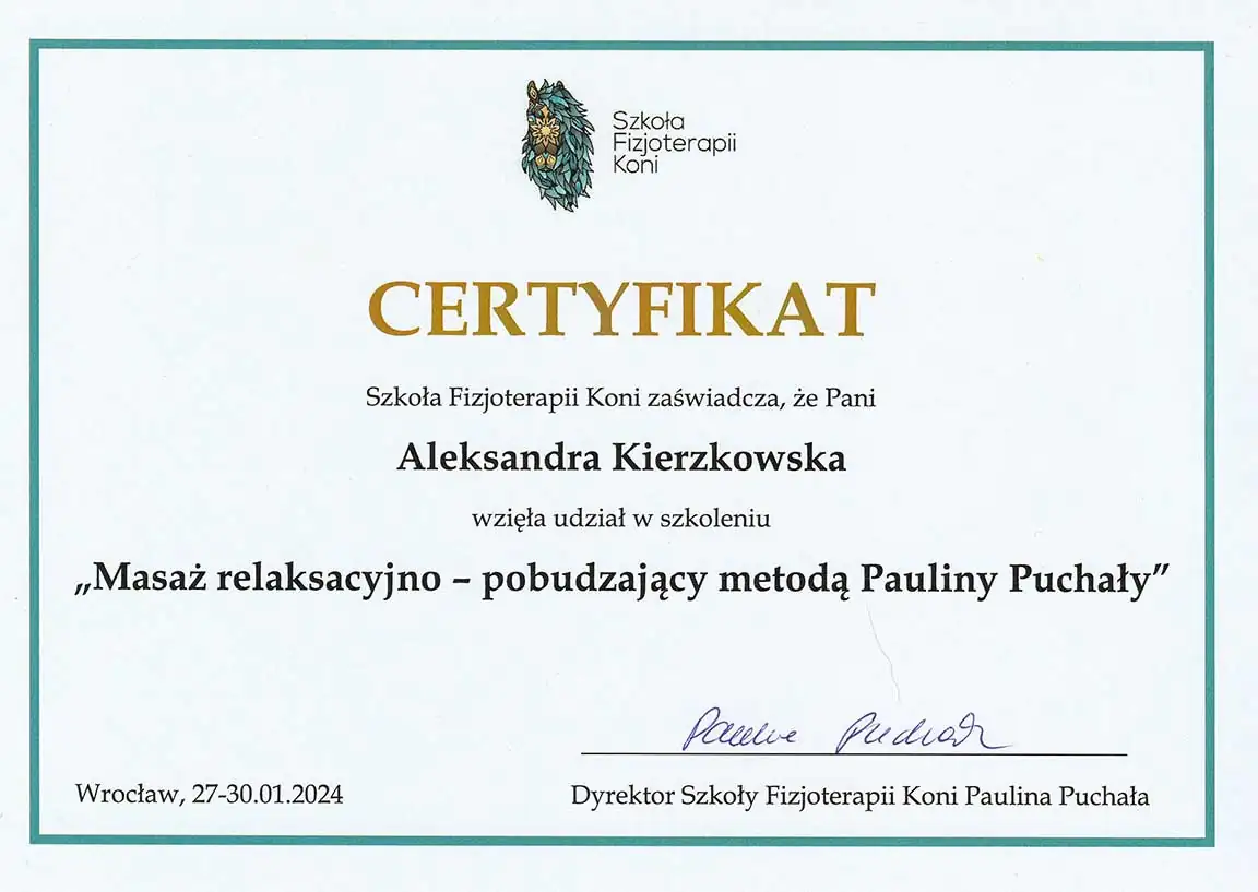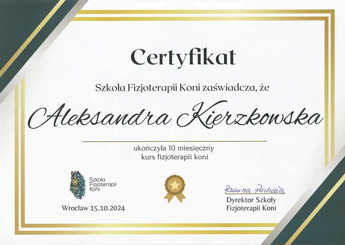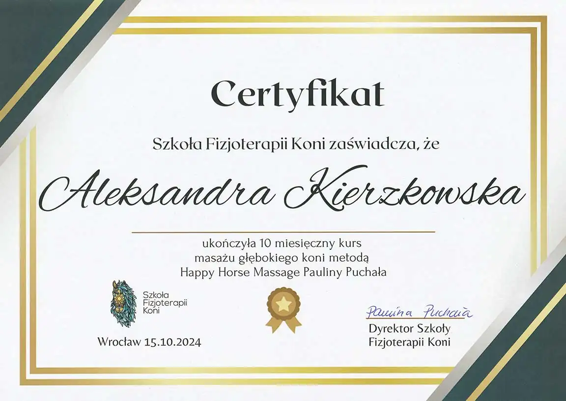 Wszechstronna wiedza, którą zdobyłam - i wciąż zdobywam - pozwala mi patrzeć na konie holistycznie. Wierzę, że wszystko ma znaczenie i każdą informację warto brać pod uwagę. Napędza mnie świadomość, że moja praca realnie pomaga koniom - poprawia ich samopoczucie, a one same pokazują, że są za to wdzięczne. Dzięki temu wiem, że to, co robię, ma sens.